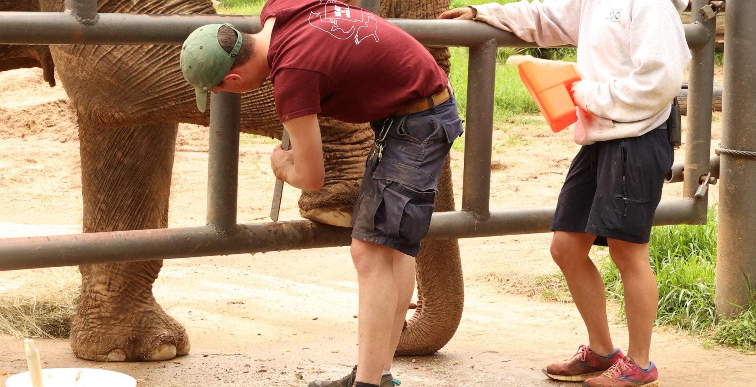 Elephant keepers performing regular foot care on one of the elephants – Karen Caster