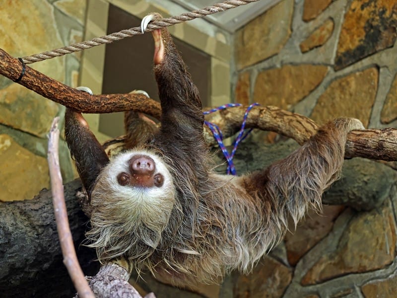 Two-Toed Sloths, also known as Linnaeus’s Sloths, are native to the forests of Central and South America. These arboreal mammals are characterized by their slow-moving nature, hook-like claws, and distinctive facial markings. Despite their name, Two-Toed Sloths actually have three toes on their hind limbs. They spend the majority of their time hanging upside down from tree branches, feeding on leaves, fruits, and flowers. At the Little Rock Zoo our sloth is housed with the White faced Sakis (exhibit next to the capuchins) on the East side of the Primate/Reptile House. Look high as they like to climb!